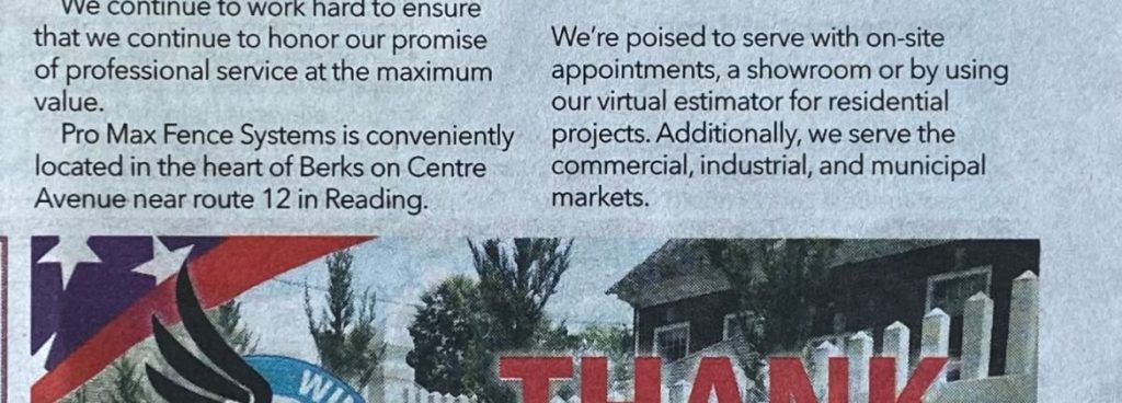 Pro Max Fence Systems is conveniently located in the heart of Berks on Centre Avenue near route 12 in Reading. We’re poised to serve with on-site appointments, a showroom or by using our virtual estimator for residential projects. Additionally, we serve the commercial, industrial, and municipal markets.